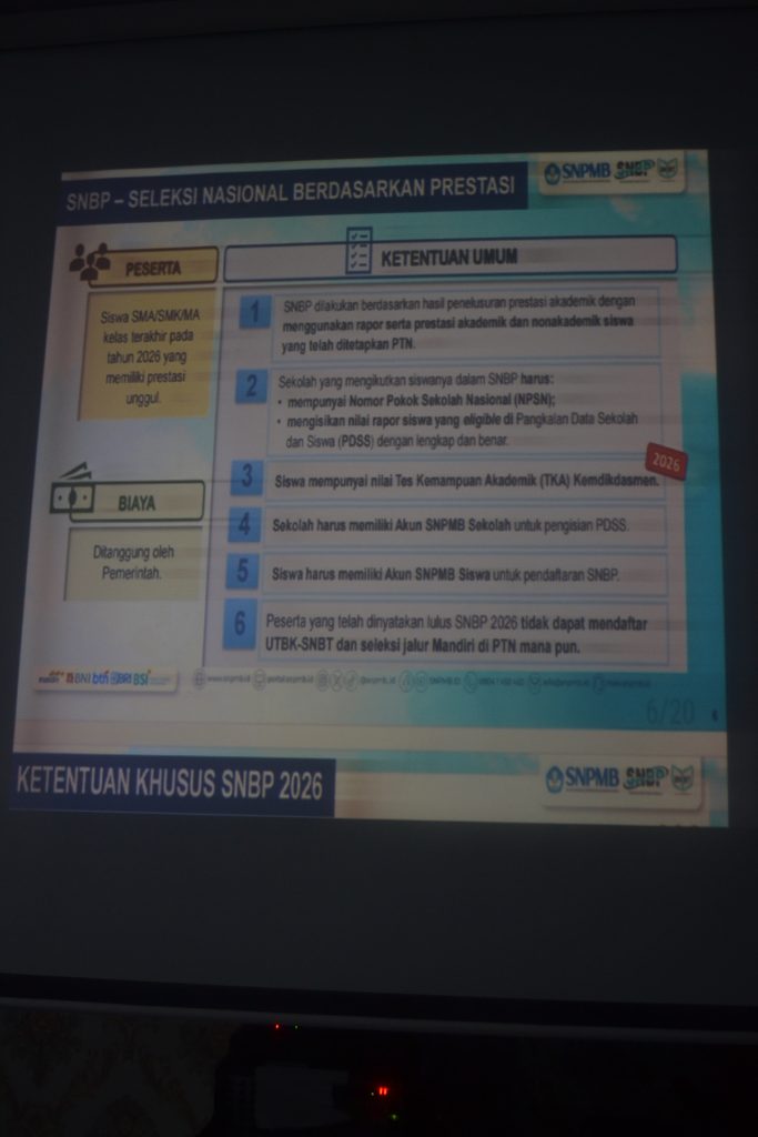 KEGIATAN SOSIALISASI JALUR SELEKSI PERGURUAN TINGGI NEGERI (PTN) TAHUN PELAJARAN 2025/2026 Tinggalkan Komentar / Uncategorized / Oleh CyberCaptain Smansa